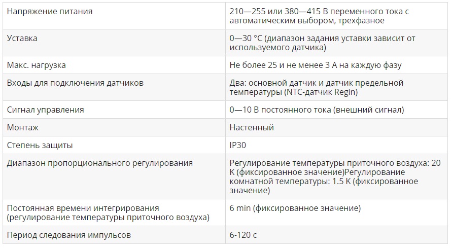 Регулятор автоматически изменяет закон управления в соответствии с динамикой объекта управления. Для быстро изменяющейся температуры, например, при регулировании температуры приточного воздуха он работает в режиме пропорционально-интегрального регулирования с фиксированной зоной пропорциональности 20 К и временем интегрирования равным 6 мин. Для медленно изменяющейся температуры, например, при регулировании температуры в помещении он работает в режиме пропорционального регулирования с фиксированной зоной пропорциональности 1,5 К. В регуляторе предусмотрено понижение температуры в ночной период с помощью блока NS/D.