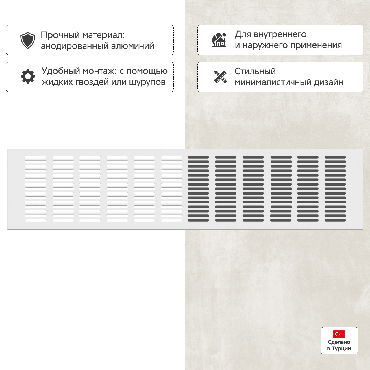Идеально при монтаже в подоконники для правильного распределения воздуха от центрального отопления, обшивки радиаторов, дверей, мебели.