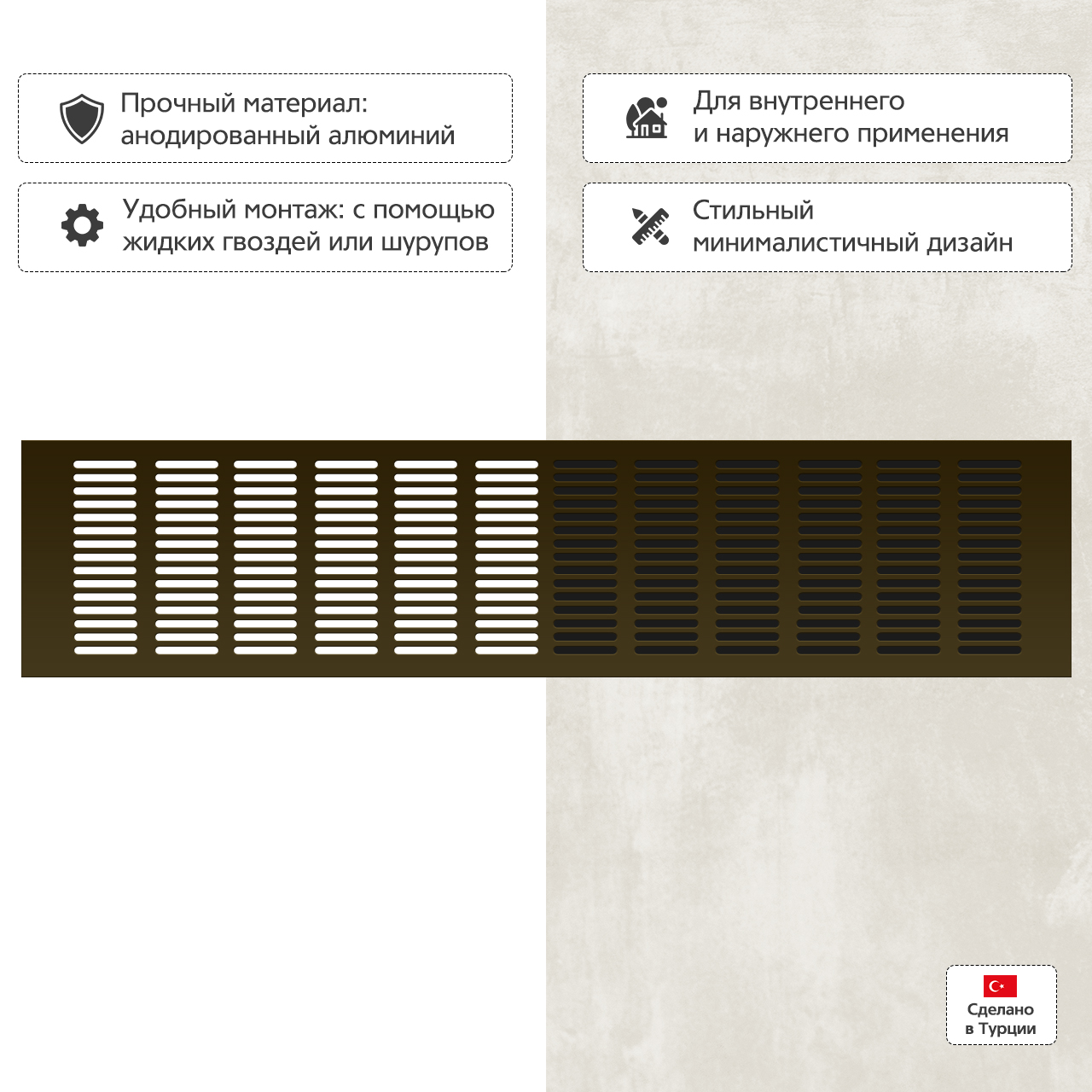 Прямоугольная вентиляционная решетка изготовлена из анодированного алюминия.