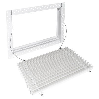 Данная решетка подходит для монтажа на любую поверхность под финишную отделку. Рамка и экран изготовлены из алюминия, опора экрана - из оцинкованной стали. Рама оснащена «полкой» 1,9 мм и рифлеными краями для большей адгезии финишного материала – шпатлевки, цемента. Решетка имеет съемную центральную часть с фиксированным углом наклона ламелей 15°. Она крепится к корпусу прочными металлическими тросиками, легко снимается для очистки и удобного обслуживания.
